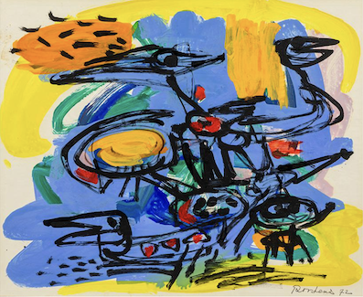 In 1954 he briefly turned to a geometric style influenced by African art. From 1956 his work increasingly features dynamically executed abstract signs on large canvases. Black paint applied in sturdy strokes plays a prominent role. Around about 1965 the fantastical beings, reminiscent of the CoBrA period, emerge again in his work. His paintings become brighter once more and remain so until his death in 1976.