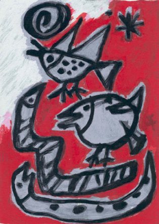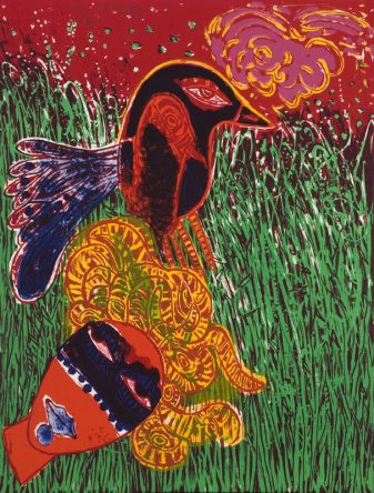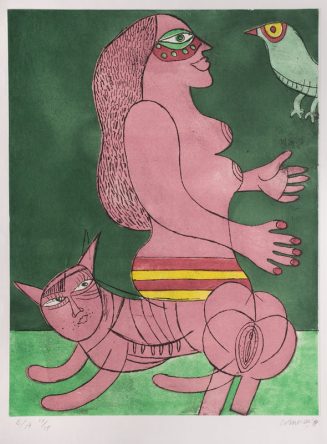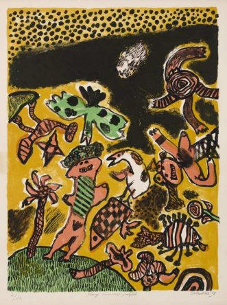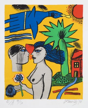 From the late Seventies onwards, Corneille’s paintings, gouaches and drawings became more representational, incorporating large areas of colour. In a lyric style he was never to abandon, he recorded what he had seen and experienced, painting visions of tropical landscapes and gardens with plants, animals and women.