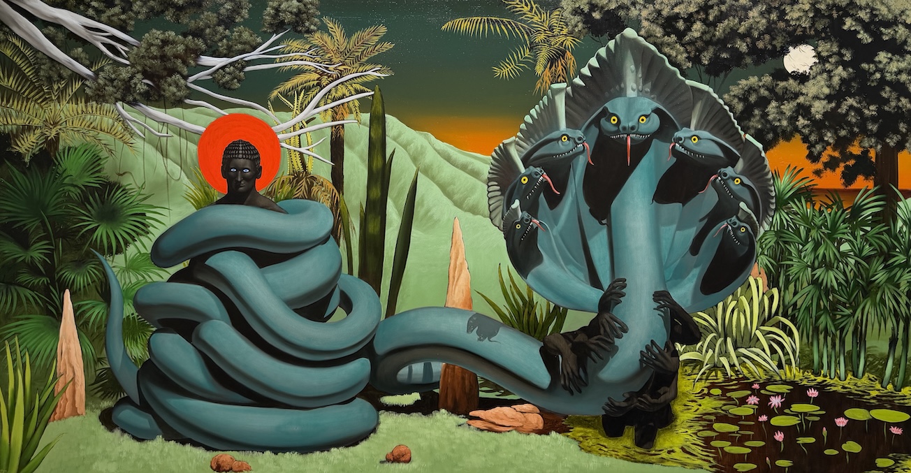 Drawing from myths across Southeast Asia and India, Sawatchrokorn explores humanity’s early reverence for all living things. Before the rise of organized religion, nature itself was seen as sacred—mysterious, dangerous, and divine. In The Totem, a human figure is enveloped by a great Naga whose form recalls Khmer sculpture. The serpent alludes to the Samudra Manthan—the churning of the ocean of milk—symbolizing the eternal cycle of creation, reverence, and transformation between human and divine.